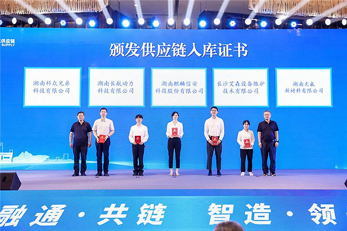 開幕式上,中國航空工業(yè)設備供應商管理委員會代表向麒麟信安、長航動力、艾森設備、科眾兄弟、天氟新材料等5家湘江新區(qū)企業(yè)頒發(fā)供應鏈入庫證書;中航國際供應鏈科技有限公司、長沙市航空航天(含北斗)產業(yè)鏈辦公室、湖南湘江新區(qū)航空航天及北斗產業(yè)鏈辦公室、長沙市湖湘軍民融合促進中心、長沙銀行簽訂框架合作協(xié)議。