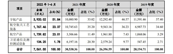 招股書顯示,航天環宇主營業務專注于航空航天領域的宇航產品、航空航天工藝裝備、航空產品和衛星通信及測控測試設備的研發和制造,主要為航空航天領域科研院所和總體單位的科研生產任務提供技術方案解決和產品制造的配套服務。公司已成為航天科技、中航工業、中國航發、中國電科、中國商飛等大型央企的核心供應商,是國家高新技術企業、國家級專精特新“小巨人”企業。